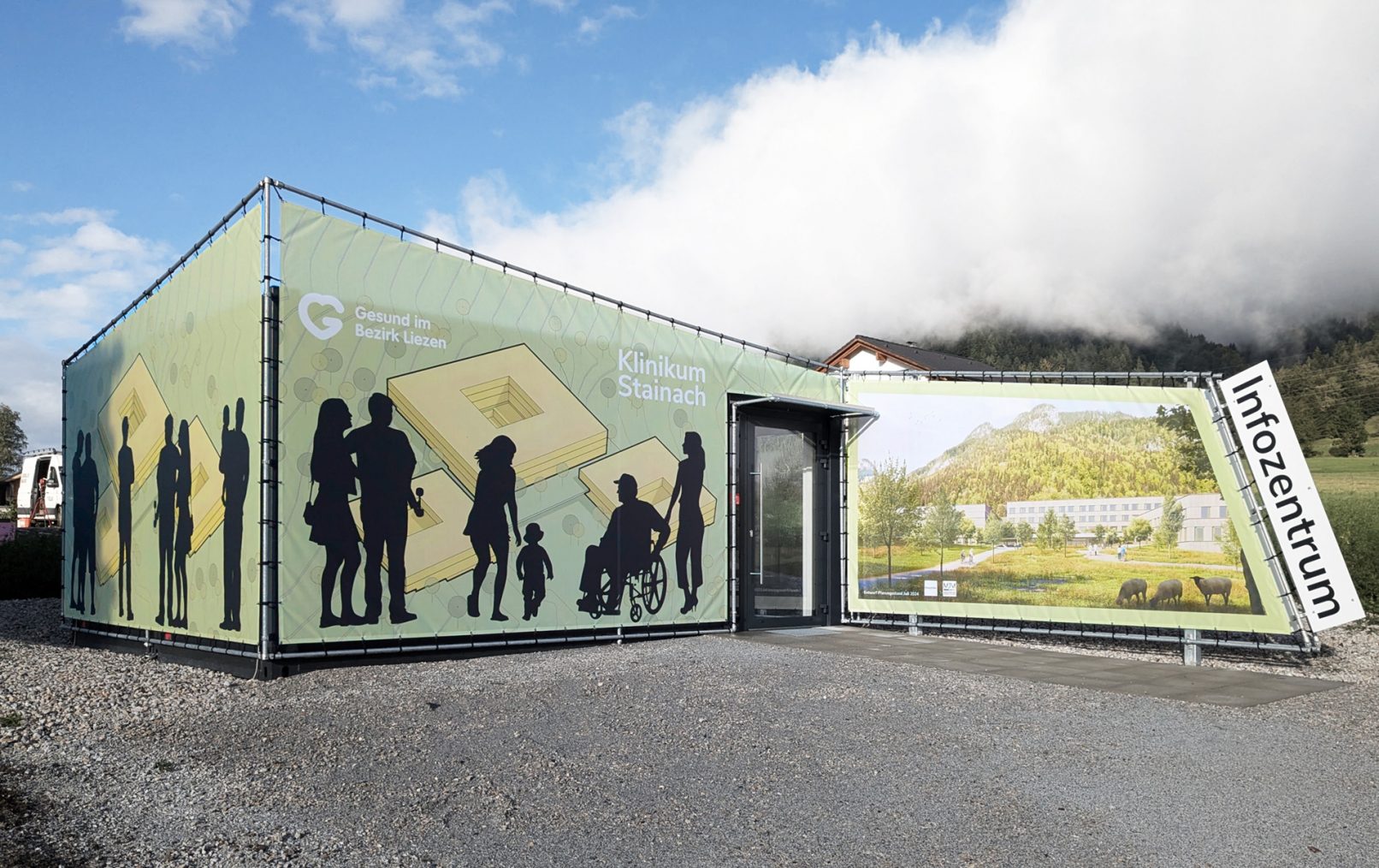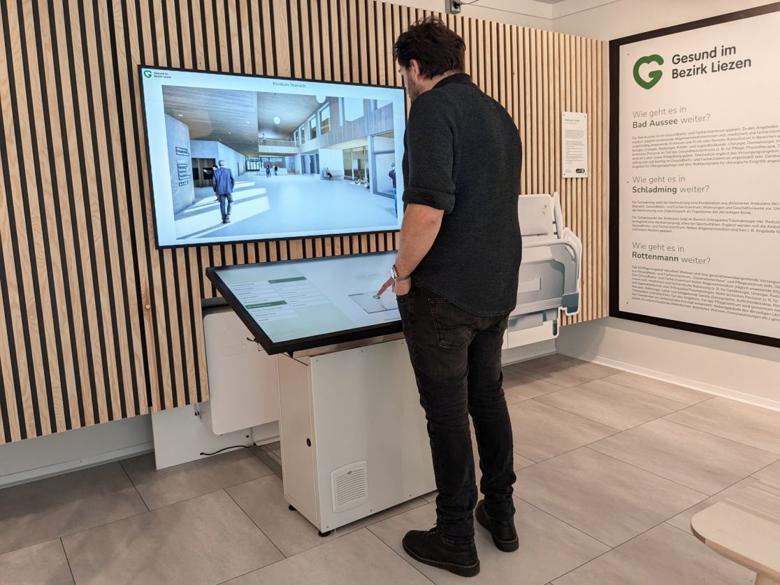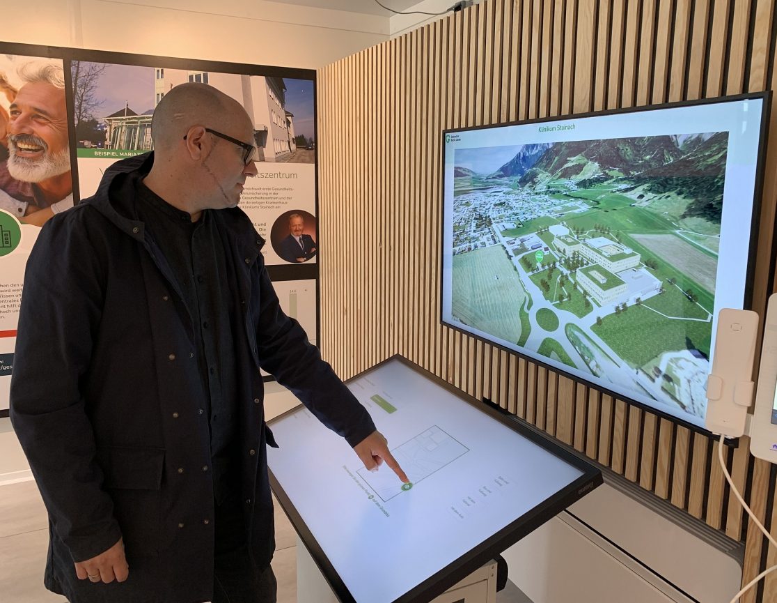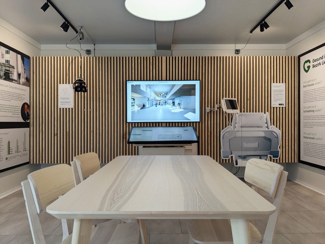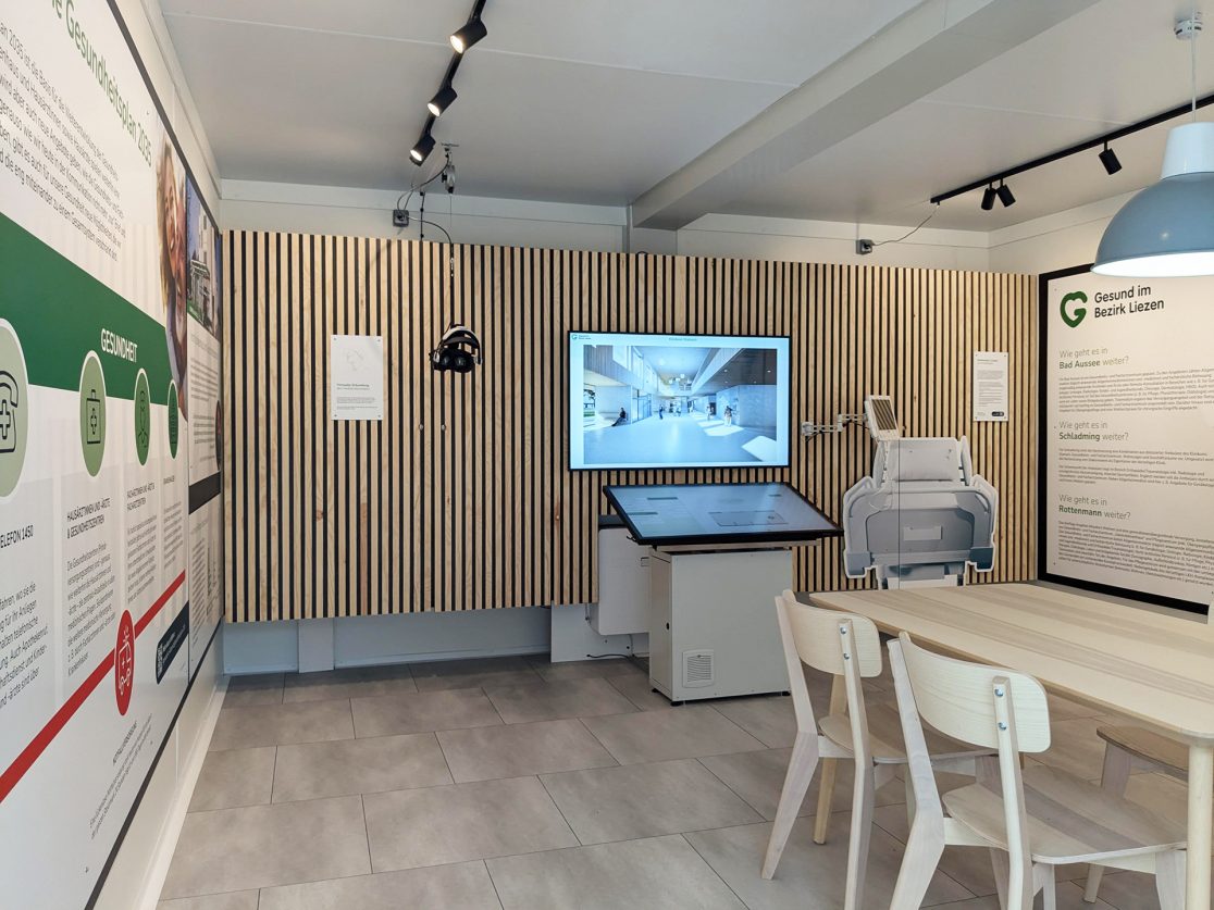 Das Informationszentrum neben der Baustelle gibt einen Überblick über die gesamte Gesundheitsversorgung im Bezirk Liezen und informiert über das Bauprojekt. Die Möglichkeit, virtuelle 3D-Rundgänge zu machen, rundet das Informationsangebot ab.